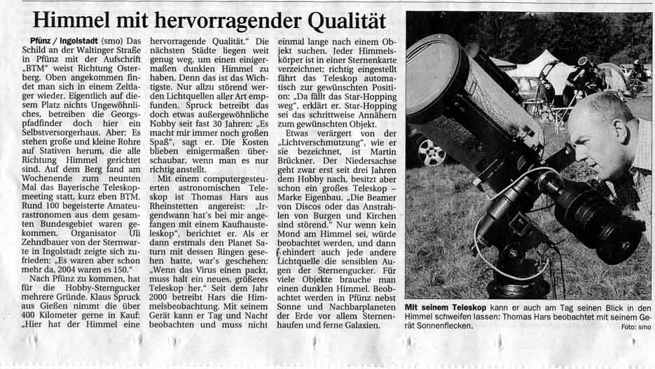 Von Mittwoch an, als die ersten Teilnehmer bereits vor Ort waren, bis zum Sonntag hatten wir durchgehend sonniges Wetter. Nur gegen die hohe Feuchtigkeit hatte man in den ersten Nächten ziemlich zu kämpfen. Das tat der guten Stimmung aber überhaupt keinen Abbruch. So erfreute man sich der insgesamt 250 interessierten Besucher aus der Region, bot Sternbildführungen an, fachsimpelte vor den zahlreichen Selbstbauten und großen Dobsons oder erzählte sich einen Schwank aus seiner Jugend… ![]() Vorträge und Astroflohmarkt bildeten das Rahmenprogramm und wer die 20 Kilometer Fahrt nach Ingolstadt auf sich zu nahm, konnte auch noch dort die laufende DLR 3D-Marsausstellung besuchen. Für warme und gute Küche war ganztätig auch hervorragend gesorgt. So konnte man es sich morgens/mittags/abends/nachts im großen Aufenthaltsraum der BTM-Hütte gemütlich machen. So verging die Zeit leider furchtbar schnell und man hätte das Treffen gerne noch eine Woche länger fortgesetzt… Danke für diese tollen Tage und Nächte! Wir sehen uns wieder beim nächsten und 10. BTM. Ich freue mich schon auf das große Jubiläumsfeuerwerk… ![]() ![]() Klare Nächte, Peter ![]() ![]() ![]() Teleskoptesten beim Augsburger Spezialisten… ![]() Steigt Stathis jetzt auf´s Fernglas um? ![]() H-alpha Sonnenbeobachtung ![]() Uli erklärt dem Nachwuchs die Funktionsweise seiner Sphinx-Montierung… ![]() ![]() ![]() Selbstbauten… ![]() ![]() ![]() Elde Holzarbeit… ![]() ![]() ![]() ![]() ![]() ![]() ![]() Demnächst folgt noch eine Erweiterung der sanitären Anlagen an der Stelle, wo einst die alte Osterberghütte stand ![]() In der Hütte ![]() Aufenthaltsraum ![]() Vortragsraum ![]() Küche ![]() ![]() ![]() BTM-Wachhund - neutralisiert jeden Weißlichtsünder… ![]() ![]() Der 20"-Lomospiegel von Jens Bohle ![]() Nur zwei Andromedaner hielten diesmal die Stellung… ![]() Prroooouust…! ![]() |