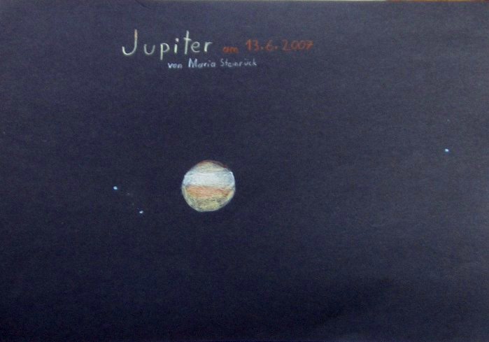 also die Zeichnung zeigt Jupiter am Abend des 13. 6. 2007, es waren meine ersten Jupiter-Beobachtungen mit dem Teleskop. Die Zeichnung ist so, wie es im Teleskop zu sehen war, also verkehrt. allerdings erschien Jupiter im Teleskop natürlich etwas kleiner, aber das ging schwer zu zeichnen. Es sind drei Monde zu sehen, nach den Daten in "Kosmos-Was tut sich am Himmel 2006/07" müssten links Europa und Kallisto sein und rechts Ganymed.