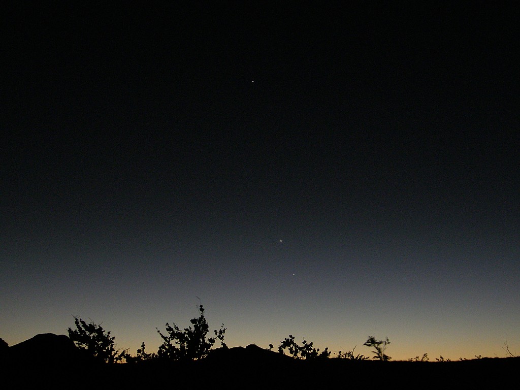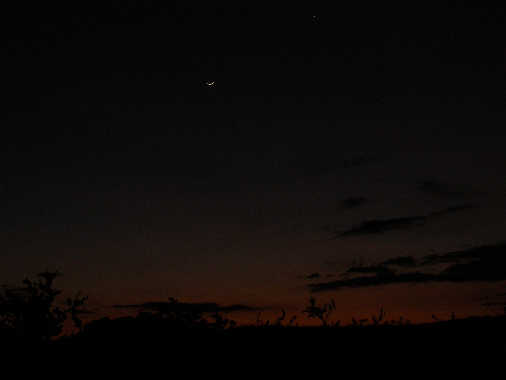 Eins habe ich noch, Venus, Mond und Jupiter von Maitland River am 1.5.2011. Merkur waere etwa 2/3 Strecke zwischen Jupiter (unten) und Venus (oben), ist aber leider nicht zu sehen, genau wie Mars, welche gleich neben Jupiter sein sollte.