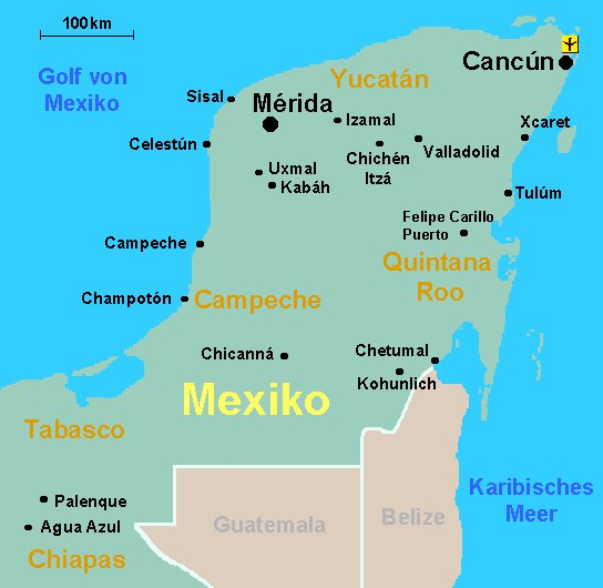 Zur Yucatan-Halbinsel zählen die Bundesstaaten Yucatan, Campeche, Quintana Roo, Guatemala und Belize. Die Halbinsel wird im Westen und Norden vom Golf von Mexiko, die Küste besteht aus Sandbänken, Lagunen und Mangrovensümpfen und im Osten vom Karibischen Meer begrenzt, die Küste kennzeichnet sich durch Korallenriffe und vorgelagerte Inseln (Cozumel, Isla Mujeres).
