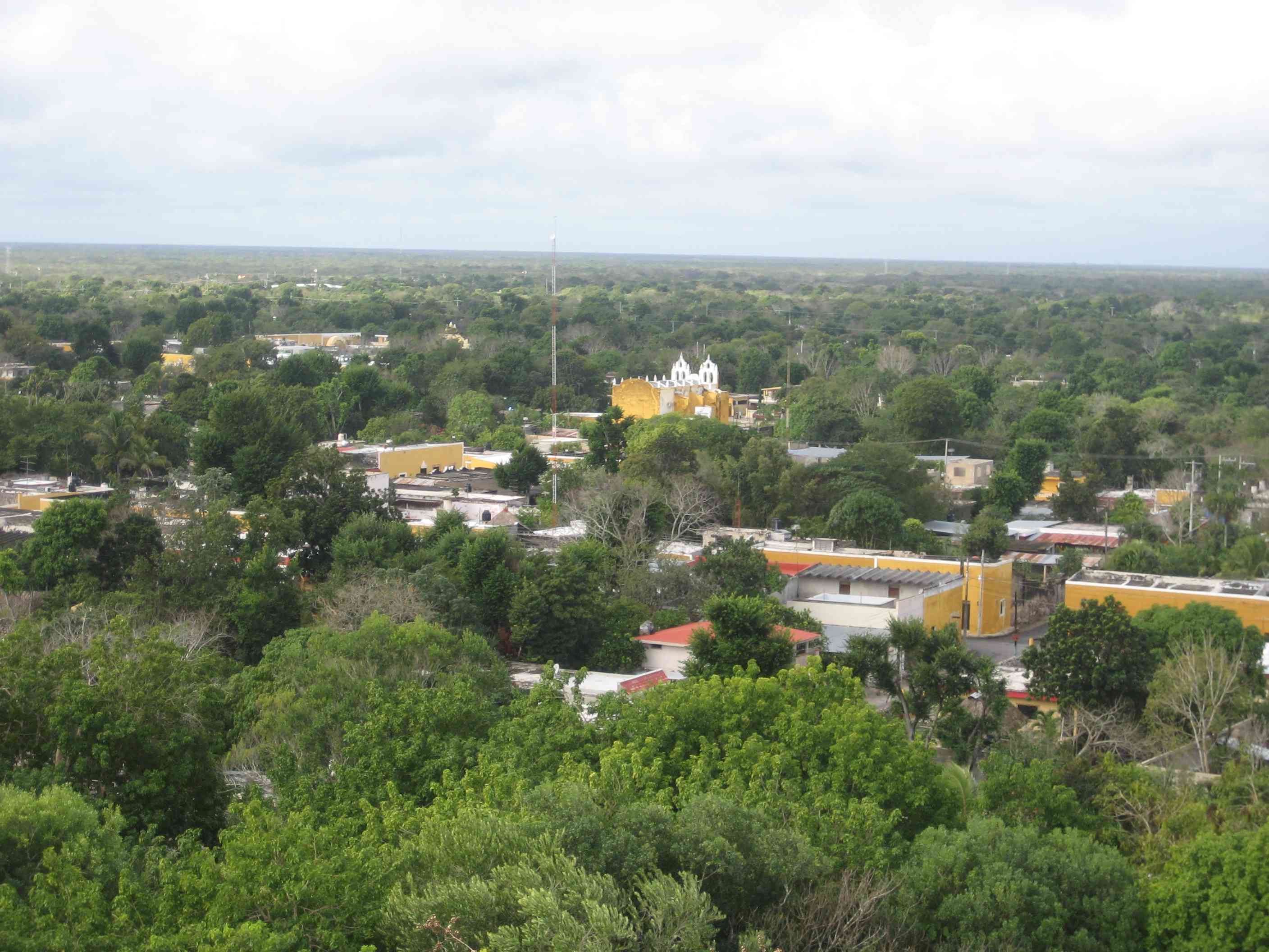 Nach dem mühseligen Aufstieg auf die Pyramide wurde man mit einem super Ausblick belohnt, hier in Richtung Marktplatz und Kloster. Der Blick richtet sich auch weit in das Gebiet in Richtung Chicxulub, wo der Dinosaurier-Meteorit  nieder ging. Von Mérida aus, hätte man in einer Stunde die Küste erreicht. Die Strände von Progreso und um Chicxulub wurden u.a. durch den Meteoriteneinschlag, der vor 65 Millionen Jahren für das Aussterben der Dinosaurier verantwortlich gemacht wird, geformt. In Chicxulub selbst gibt es laut Reiseleitung ein 1 km2 großes Gebiet, was den  Einschlag markiert und als Zentralregion besichtigt werden kann. Muss ich unbedingt einmal extra machen, am besten ohne Reisegruppe ;)