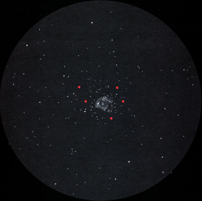 Man muss da immer etwas experimentieren, d.h. es hängt diesbezüglich viel vom Objekt und den Gegebenheiten (hellere Sterne in direkter Nähe etc.) ab. Schwierig, da konkrete Anweisungen oder Tipps zu geben, aber ich versuche es mal verallgemeinert: Man schaut beim indirekten Sehen "leicht" neben das Objekt, d.h. schon etwas weiter weg als auf den Übergang des Objekts und des Hintergrunds. Mal ein Beispiel… unser Andromedaner "Astrogucker" (aka Jesus ![]() Ich habe mir mal erlaubt, das Bild etwas zu bearbeiten. Gehen wir davon aus, dass das ein beliebiger Nebel wäre (d.h. nicht M11), den wir so im Teleskop sehen. Ich würde mich wahrscheinlich, wenn ich mehr Details wahrnehmen möchte, in etwa auf die roten Punkte konzentrieren, um indirektes Sehen anzuwenden. Das heißt ich bewege mich, wenn ich die indirekte Sehtechnik anwenden möchte, i.d.R. etwa 1/2 bis maximal 2 Objektdurchmesser mit dem Auge neben das Objekt. Ich persönlich suche mir immer einen sternlosen Fleck raus, wo mich eben kein Stern ablenkt oder blendet und konzentriere mich entsprechend auf diesen sternlosen Fleck - wie wenn man einen dieser roten Punkte anstarren würde ![]() Viele Grüße, Tobias
