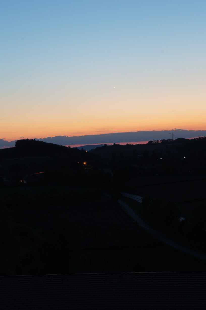 Nach langer Zeit mal wieder ein Lebenszeichen von mir. In letzter Zeit hatte ich Viel zu tun und wenig Zeit und die Zeit die ich hatte habe ich mit meiner neuen schönen Beziehung verbracht. Aber etwas astronomie habe ich trotzdem noch betrieben. Gestern war ich mal wieder Nachts drausen bis der Mond zu weit oben war. Das Bild ist auch an dem Abend entstanden, etwas früher. Beobachtet haben wir eigentlich nur Saturn, Herkules Haufen, Ringnebel, M51 und am Ende den Mond. PS: Das Unterste Bild soll ein Dreieck von Jupiter, Venus und Merkur Gruß Manuel