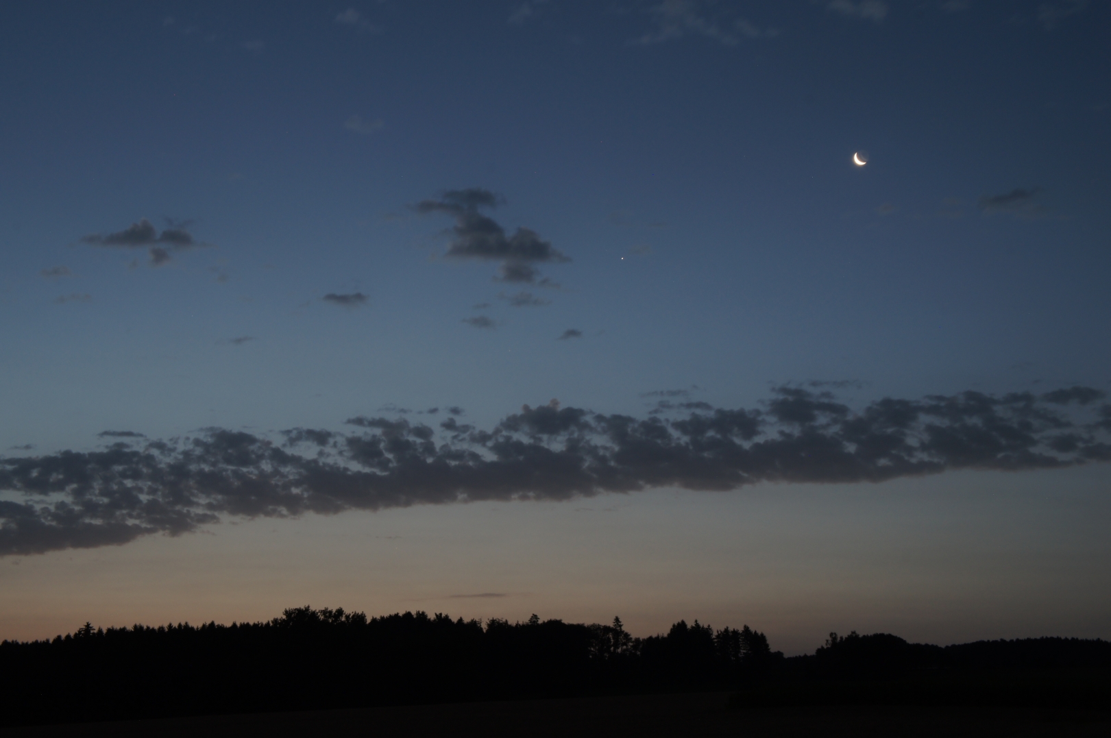 So eine Konjunktion aufzunehmen, ist schwerer als es scheint. Die persönliche Wahrnehmung vor Ort ist halt doch immer "fokussierter"… Objektiv gesehen kann ich neben dem Mond nur ein helleres Objekt als Planet ausmachen (Jupiter, nehm ich an). Der Rest ist ohne genaue Kenntnisse schwer zuzuordnen - könnten auch Hintergrundsterne oder sogar Hotpixel sein. Ich denke, mehr Brennweite würde helfen, um die Aufmerksamkeit noch mehr auf die Konjunktion zu lenken. Entweder, du verzichtest dann auf die Landschaft als Beiwerk oder versuchst ein Hochformat… Um die Planeten deutlicher abzulichten, kann in diesem Fall auch eine längere Belichtungszeit (oder höhere ISO, falls es das Rauchen zulässt - 200 ist nicht sehr viel…) nicht schaden. |