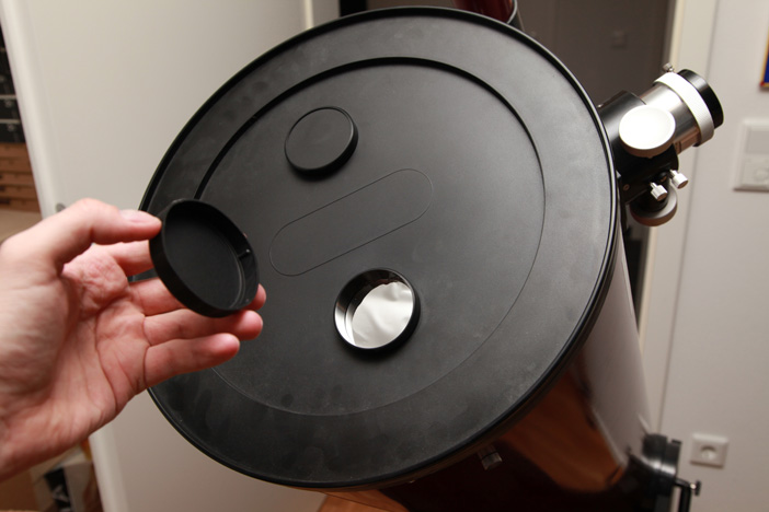 Wenn ich Dich richtig verstehe, befinden sich an der Objektivabdeckung nochmal ein kleinerer Deckel. Hab das mal bei unserem Teleskop fotografiert, bei mir gibt es zwei kleine Deckel, siehe Anhang - ist es das, was Du meinst?