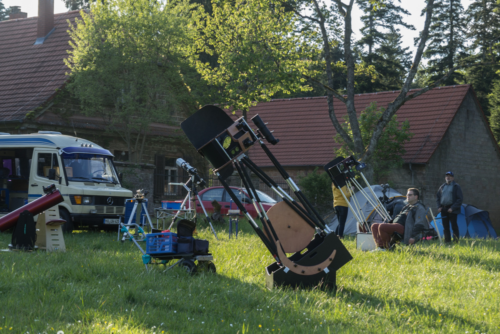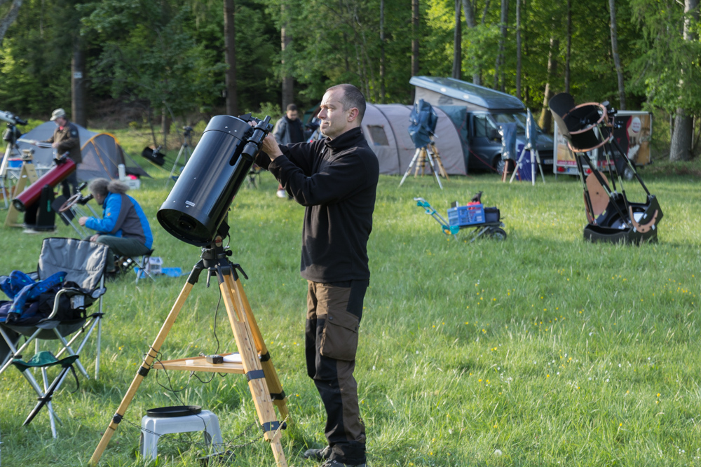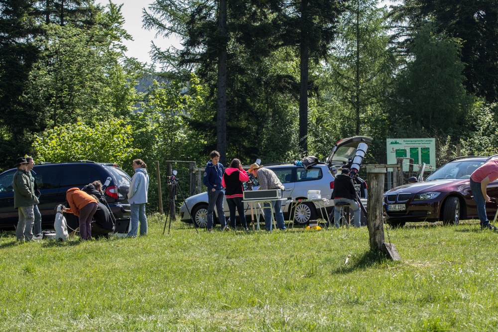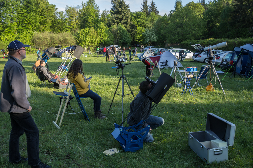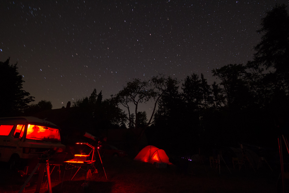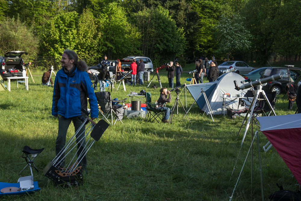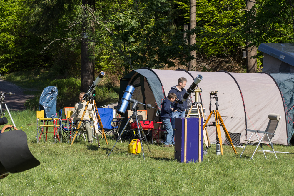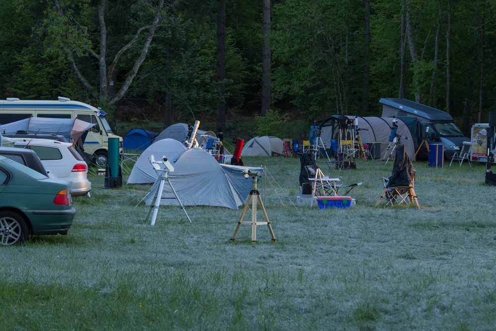 Hier kommt mein Bericht zu den Taubensuhler Astro Nächten (ehemals SATT) im Herzen der Pfalz vom 01.05. - 04.05.2014: Am ersten Mai 2014 ging es für mich los. Nachdem alles im Auto verstaut war und das Gefühl losfahren zu wollen stärker war als das „du hast noch was vergessen, kommst aber nicht drauf was“ setzte ich den Motor bei strahlendem Sonnenschein und ca. 20°C in Bewegung Richtung Pfalz. Von den 300 Kilometern sollte ich dann jedoch über 2/3 im strömenden Regen fahren. Warum fahre ich eigentlich von der Sonne in den Regen zum Zelten?! ;-) Doch entgegen jeglicher Wetterprognose wurde ich auf dem Taubensuhl mit Sonnenstrahlen begrüßt. Nach kurzer Einweisung von Chef Enzo ging es erstmal ans Zelt samt Wohnzimmer aufbauen. Das war aber trotz der Größe erstaunlich schnell erledigt. Danach und teils auch schon während dessen wurden die anderen schon anwesenden Teilnehmer begrüßt. Einige schon bekannte Gesichter wie auch ein paar Neue und eine Jugendgruppe aus Weil der Stadt. Die Atmosphäre war wie gewohnt freundlich, herzlich und familiär. Die Wetterprognose von meteoblue versprach eine Besserung ab Freitag Nachmittag und die Nacht auf Samstag. Die erste Nacht sollte also mit gemütlichem Beisammensein beginnen. Also auf in die Waldwerkstatt und die Anmeldung fertig machen. Dort saß man dann auch noch den Abend, bis jemand zur fortgeschrittenen Dämmerung draußen Sterne sah. Also nichts wie raus auf die Wiese und das Teleskop aus den Zelt geholt. Binnen Minuten stand mein 8“ Dobson samt EQ-Plattform. Beobachtet wurde Mars und das Leo-Triplett. Dann zog aber rasch Nebel aus dem Tal hinauf und nur wenige Minuten später war am Himmel nichts mehr zu sehen. Also nochmals in die Waldwerkstatt auf ein gemütliches Bier. So klang der erste Abend aus. Der Freitag war am Himmel von der Farbe Grau dominiert und es machte auch keinen Anschein der Besserung. Selbst die Prognose wurde nach unten korrigiert. Während es draußen immer wieder regnete wurde drinnen der Tag fürs Planen und Fachsimpeln genutzt und der Abend wurde gemütlich angegangen. Bis gegen ein Uhr nachts waren leider immer noch keine Sterne sichtbar, also kroch ich in meinen Schlafsack. Am Vormittag des Samstages war es immer noch bewölkt, doch inzwischen war es überwiegend trocken. Weitere Gäste kamen an und die Lichtung füllte sich Zunehmens. Nachmittags standen drei Vorträge auf dem Programm. Den Anfang machte Hilmar mit der Vorstellung der Sternwarte Schönau im Schwarzwald. Gefolgt von Wally über Raster-Elektronenmikroskope und Mondgestein. Zum Abschluss gab es noch von Alex einen Reisebericht zu den Hurtigruten und den Polarlichtern. Während den Vorträgen klarte es draussen immer mehr auf. Nach einem warmen Snack ging es dann auf die Wiese. Zahlreiche Teleskope wurden aufgebaut. Vom Bauhaus-Teleskop mit nur ein paar Zentimetern Öffnung bis hin zum 20“ Dobson war alles vertreten. Am späten Abend wurde hier und da noch die Sonne beobachtet. In der Dämmerung stand dann der Mond sowie Jupiter auf dem Programm. Die Nacht war komplett klar, aber sehr feucht und kalt (Temperaturen um den Gefrierpunkt und darunter bei einer Luftfeuchte über 90%). Neben Jupiter, Mars und Saturn wurden viele Deepsky Objekte beobachtet. Anfangs noch Galaxien im Löwen und der Jungfrau, später dann auch die Nebel in der Sommermilchstraße sowie im Schützen. Ein Highlight war mit Sicherheit der Komet Panstarrs, der in den Jagdhunden nahe der Deichsel des großen Wagens zu finden war. Im großen Dobson zeigte sich ein langer Schweif. Zugetauten Spiegeln und Linsen wurde mit Heizungen, Heizpads sowie Föns Abhilfe geschaffen. Ich glaube keine Optik ist in dieser Nacht verschont geblieben. In den frühen Morgenstunden wurde es dann ruhiger auf der Wiese und der Tau begann zu frieren. Kurz vor dem Sonnenaufgang konnte noch Venus zwischen den Baumspitzen gesichtet werden. Im Teleskop zeigte ich die Dreiviertelvenus aber auf Grund der geringen Höhe nur wild tanzend. Gegen halb 7 nach dem Sonnenaufgang verzog ich mich ins Zelt. Bereits drei Stunden später weckte mich die Sonne als sie vom tiefblauen Himmel direkt auf mein Zelt schien. Draußen waren die Sonnenbeobachter schon am Werk und auch die Venus konnte noch einmal durch ein Teleskop beobachtet werden - jetzt wesentlich ruhiger. Zahlreiche Teleskope waren mit Sonnenfilter ausgestattet. Vom Feldstecher mit Filterfolie bis zum 6“ Lunt Hα Teleskop war alles im Einsatz. Einige Flecken sowie auch Protuberanzen waren schön zu beobachten. Nach einem gemütlichen Frühstück vor dem Zelt ging es langsam ans Abbauen. Schließlich lagen noch 300 Kilometer Heimweg vor mir - zum Glück ohne Stau. Alles zusammen war es ein hervorragendes Teleskoptreffen mit ausgezeichneter Organisation, netten freundlichen Leuten und an einem schönen Ort. Was will man mehr? Vielen Dank an die Sternwarte Bellheim mit deren Mitgliedern fürs Organisieren und die Verpflegung, Petrus fürs Wetter der letzten Nacht und allen die mit dabei waren fürs Kommen. Bis in einem Jahr wieder auf dem Taubensuhl! (Oder davor schon auf einem anderen Treffen ;-) ) Achja, bevor ich es noch vergesse. Hier gehts zum Timelapse-Viedeo auf Vimeo! Viele Grüße, Johannes