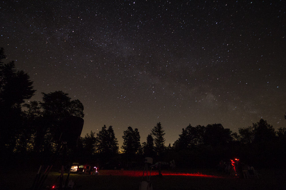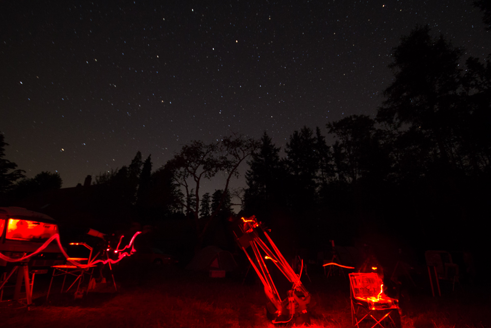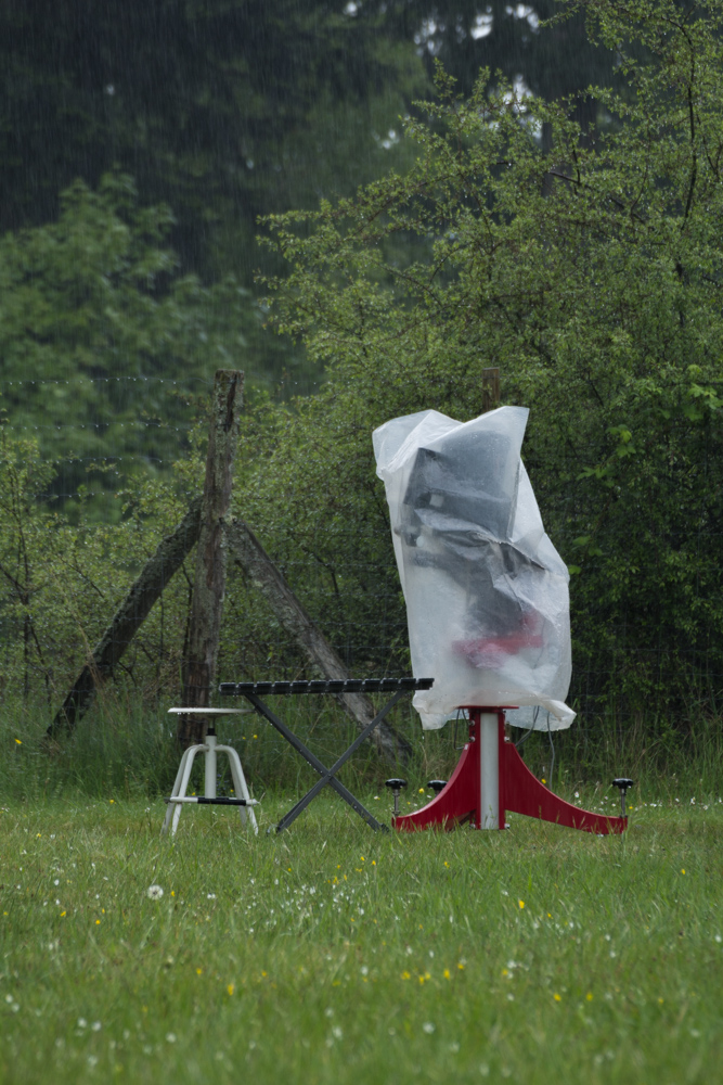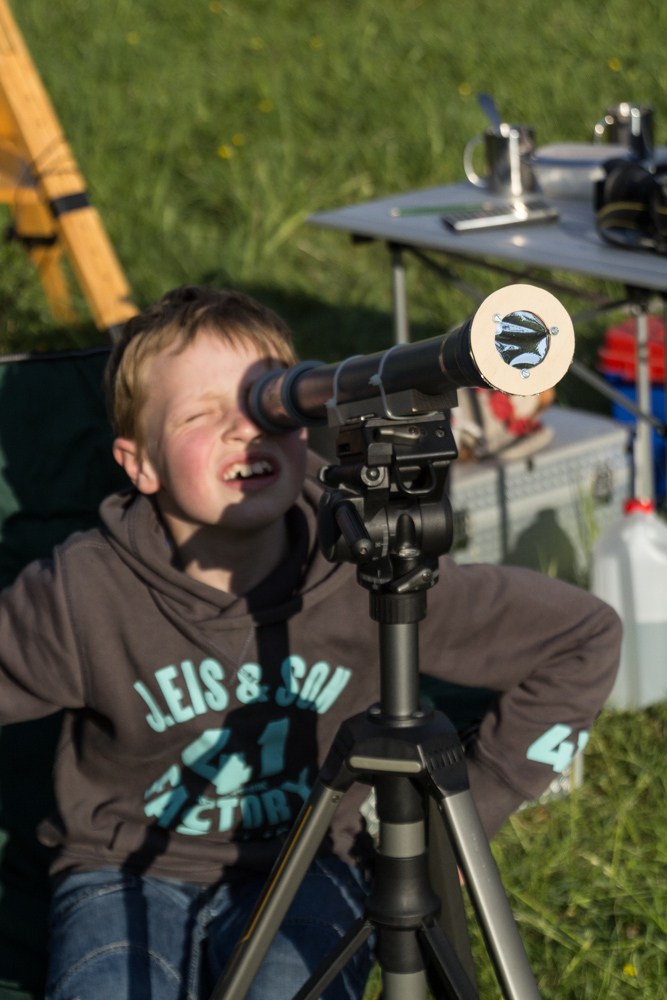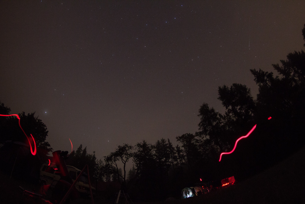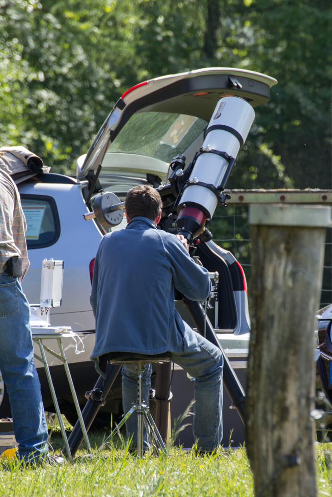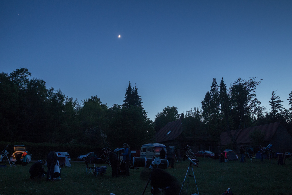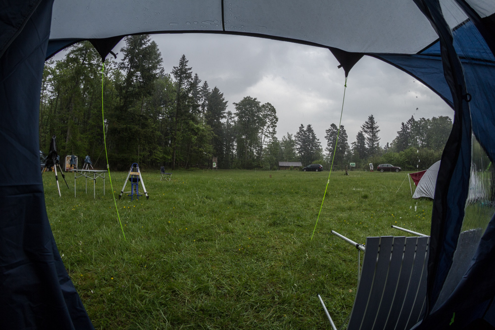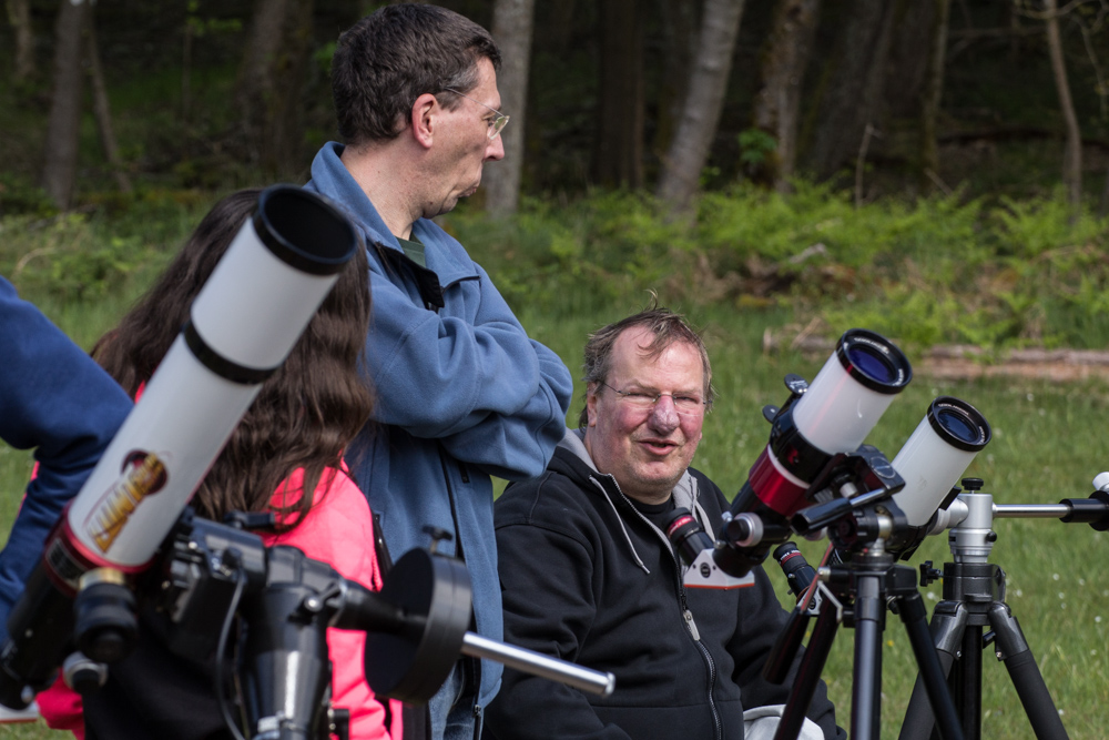 Hier kommt mein Bericht zu den Taubensuhler Astro Nächten (ehemals SATT) im Herzen der Pfalz vom 01.05. - 04.05.2014: Am ersten Mai 2014 ging es für mich los. Nachdem alles im Auto verstaut war und das Gefühl losfahren zu wollen stärker war als das „du hast noch was vergessen, kommst aber nicht drauf was“ setzte ich den Motor bei strahlendem Sonnenschein und ca. 20°C in Bewegung Richtung Pfalz. Von den 300 Kilometern sollte ich dann jedoch über 2/3 im strömenden Regen fahren. Warum fahre ich eigentlich von der Sonne in den Regen zum Zelten?! ;-) Doch entgegen jeglicher Wetterprognose wurde ich auf dem Taubensuhl mit Sonnenstrahlen begrüßt. Nach kurzer Einweisung von Chef Enzo ging es erstmal ans Zelt samt Wohnzimmer aufbauen. Das war aber trotz der Größe erstaunlich schnell erledigt. Danach und teils auch schon während dessen wurden die anderen schon anwesenden Teilnehmer begrüßt. Einige schon bekannte Gesichter wie auch ein paar Neue und eine Jugendgruppe aus Weil der Stadt. Die Atmosphäre war wie gewohnt freundlich, herzlich und familiär. Die Wetterprognose von meteoblue versprach eine Besserung ab Freitag Nachmittag und die Nacht auf Samstag. Die erste Nacht sollte also mit gemütlichem Beisammensein beginnen. Also auf in die Waldwerkstatt und die Anmeldung fertig machen. Dort saß man dann auch noch den Abend, bis jemand zur fortgeschrittenen Dämmerung draußen Sterne sah. Also nichts wie raus auf die Wiese und das Teleskop aus den Zelt geholt. Binnen Minuten stand mein 8“ Dobson samt EQ-Plattform. Beobachtet wurde Mars und das Leo-Triplett. Dann zog aber rasch Nebel aus dem Tal hinauf und nur wenige Minuten später war am Himmel nichts mehr zu sehen. Also nochmals in die Waldwerkstatt auf ein gemütliches Bier. So klang der erste Abend aus. Der Freitag war am Himmel von der Farbe Grau dominiert und es machte auch keinen Anschein der Besserung. Selbst die Prognose wurde nach unten korrigiert. Während es draußen immer wieder regnete wurde drinnen der Tag fürs Planen und Fachsimpeln genutzt und der Abend wurde gemütlich angegangen. Bis gegen ein Uhr nachts waren leider immer noch keine Sterne sichtbar, also kroch ich in meinen Schlafsack. Am Vormittag des Samstages war es immer noch bewölkt, doch inzwischen war es überwiegend trocken. Weitere Gäste kamen an und die Lichtung füllte sich Zunehmens. Nachmittags standen drei Vorträge auf dem Programm. Den Anfang machte Hilmar mit der Vorstellung der Sternwarte Schönau im Schwarzwald. Gefolgt von Wally über Raster-Elektronenmikroskope und Mondgestein. Zum Abschluss gab es noch von Alex einen Reisebericht zu den Hurtigruten und den Polarlichtern. Während den Vorträgen klarte es draussen immer mehr auf. Nach einem warmen Snack ging es dann auf die Wiese. Zahlreiche Teleskope wurden aufgebaut. Vom Bauhaus-Teleskop mit nur ein paar Zentimetern Öffnung bis hin zum 20“ Dobson war alles vertreten. Am späten Abend wurde hier und da noch die Sonne beobachtet. In der Dämmerung stand dann der Mond sowie Jupiter auf dem Programm. Die Nacht war komplett klar, aber sehr feucht und kalt (Temperaturen um den Gefrierpunkt und darunter bei einer Luftfeuchte über 90%). Neben Jupiter, Mars und Saturn wurden viele Deepsky Objekte beobachtet. Anfangs noch Galaxien im Löwen und der Jungfrau, später dann auch die Nebel in der Sommermilchstraße sowie im Schützen. Ein Highlight war mit Sicherheit der Komet Panstarrs, der in den Jagdhunden nahe der Deichsel des großen Wagens zu finden war. Im großen Dobson zeigte sich ein langer Schweif. Zugetauten Spiegeln und Linsen wurde mit Heizungen, Heizpads sowie Föns Abhilfe geschaffen. Ich glaube keine Optik ist in dieser Nacht verschont geblieben. In den frühen Morgenstunden wurde es dann ruhiger auf der Wiese und der Tau begann zu frieren. Kurz vor dem Sonnenaufgang konnte noch Venus zwischen den Baumspitzen gesichtet werden. Im Teleskop zeigte ich die Dreiviertelvenus aber auf Grund der geringen Höhe nur wild tanzend. Gegen halb 7 nach dem Sonnenaufgang verzog ich mich ins Zelt. Bereits drei Stunden später weckte mich die Sonne als sie vom tiefblauen Himmel direkt auf mein Zelt schien. Draußen waren die Sonnenbeobachter schon am Werk und auch die Venus konnte noch einmal durch ein Teleskop beobachtet werden - jetzt wesentlich ruhiger. Zahlreiche Teleskope waren mit Sonnenfilter ausgestattet. Vom Feldstecher mit Filterfolie bis zum 6“ Lunt Hα Teleskop war alles im Einsatz. Einige Flecken sowie auch Protuberanzen waren schön zu beobachten. Nach einem gemütlichen Frühstück vor dem Zelt ging es langsam ans Abbauen. Schließlich lagen noch 300 Kilometer Heimweg vor mir - zum Glück ohne Stau. Alles zusammen war es ein hervorragendes Teleskoptreffen mit ausgezeichneter Organisation, netten freundlichen Leuten und an einem schönen Ort. Was will man mehr? Vielen Dank an die Sternwarte Bellheim mit deren Mitgliedern fürs Organisieren und die Verpflegung, Petrus fürs Wetter der letzten Nacht und allen die mit dabei waren fürs Kommen. Bis in einem Jahr wieder auf dem Taubensuhl! (Oder davor schon auf einem anderen Treffen ;-) ) Achja, bevor ich es noch vergesse. Hier gehts zum Timelapse-Viedeo auf Vimeo! Viele Grüße, Johannes